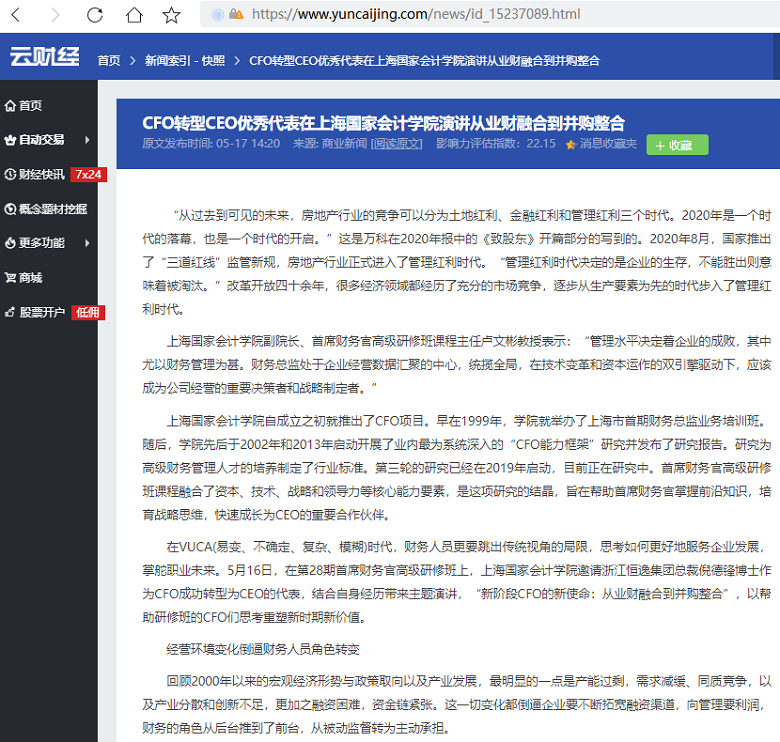 CFO转型CEO优秀代表在上海国家会计学院演讲从业财融合到并购整合【2021年5月17日,云财经】