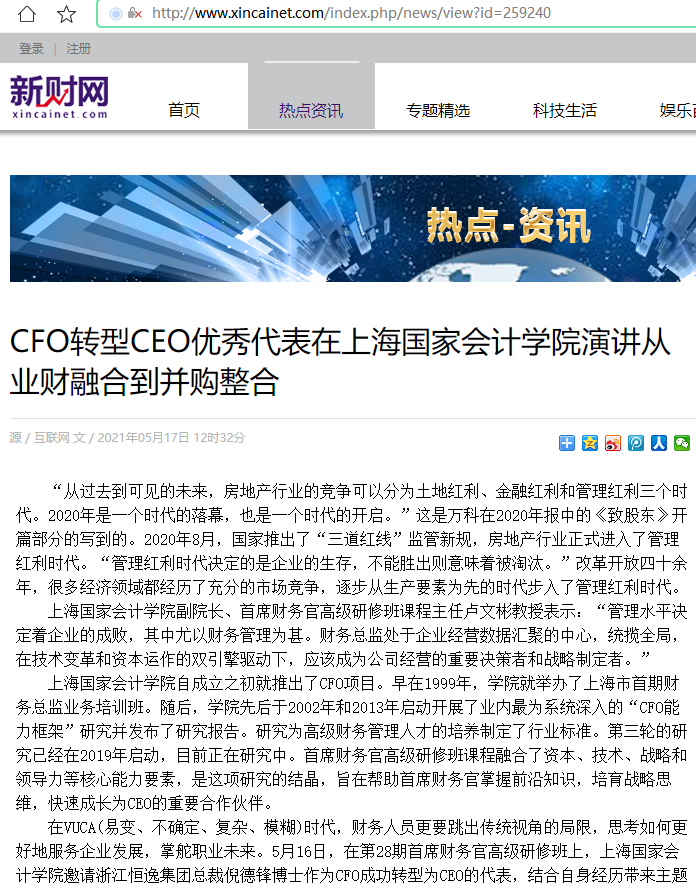 CFO转型CEO优秀代表在上海国家会计学院演讲从业财融合到并购整合【2021年5月17日,新财网】