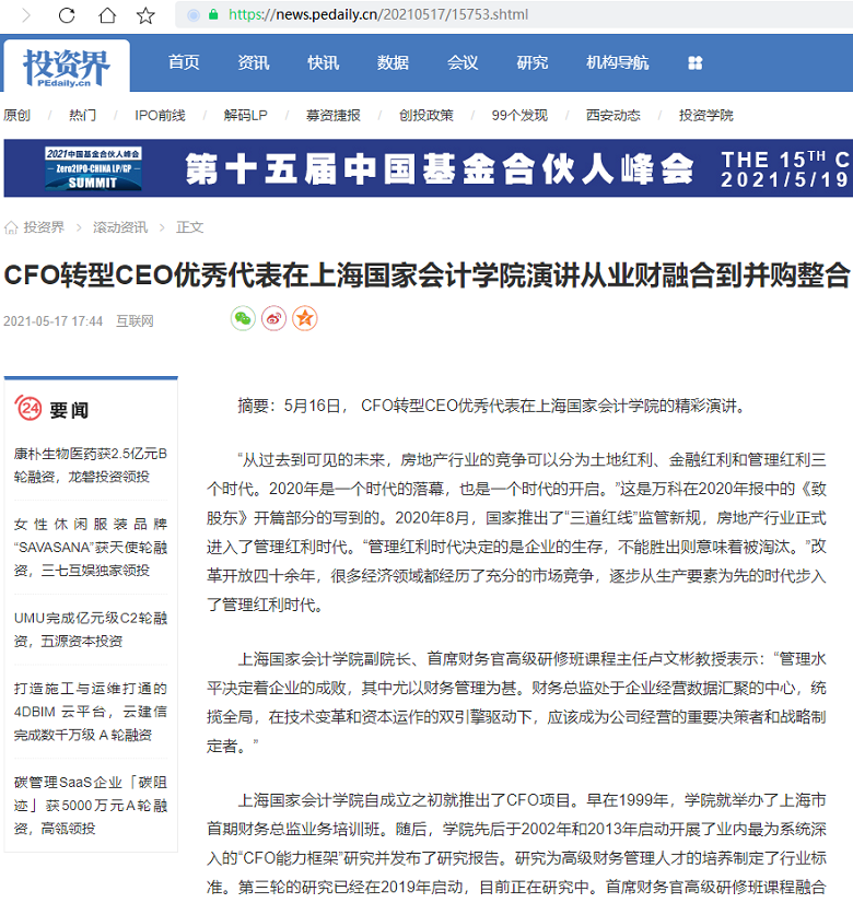 CFO转型CEO优秀代表在上海国家会计学院演讲从业财融合到并购整合【2021年5月17日,投资界】
