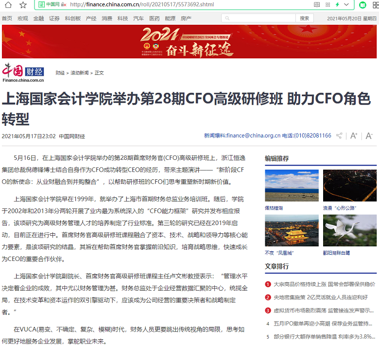 CFO转型CEO优秀代表在上海国家会计学院演讲从业财融合到并购整合【2021年5月17日,中国网】