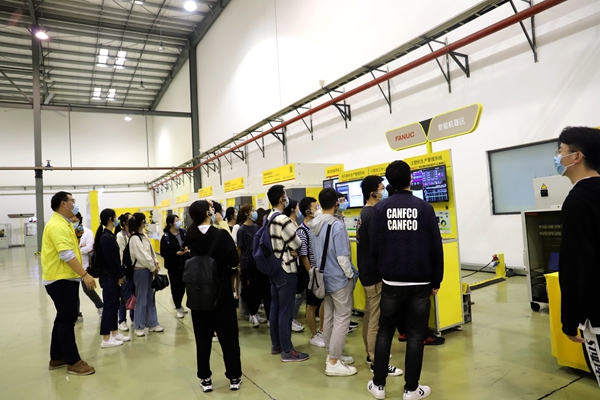 本次的参观学习内容丰富充实,干货满满。首先,上海发那科机器人有限公司党委副书记、董事、财务总监周百英女士及许俊科长等公司领导,带领我们在展示厅参观了机器人自动化生产线、自动化工业技术控制设备及机器人系统运作过程。许科长为我们详细介绍了发那科的各种智能机器人产品及其所适用的行业及相关应用场景。例如,可以通过物联网技术收集信息并随时查看设备状态的iSCADA系统;能够对于周边设备分析预警的iCARE系统;负责生产执行管理的iMES系统;能够通过视觉系统准确抓取传送带上物体的自动化机器人;触碰则可停止工作、无需大规模改造的人机协作机器人;具有强大重物搬运能力和动作方位的超大机器人整车搬运系统;可由MES调度、实现长时间无人化生产和自动监控产品质量的标准型模具加工自动化线;可通过视觉检测修磨和卸帽异常的伺服修磨换帽一体机;可自动寻边和折弯跟随的钣金折弯自动化系统;具有环境耐受性能的冲压机器人;适用于物流领域的智能机器人物流拆垛自动化系统及智能仓储柔性分拣系统等。此外,许科长还为我们全面展示了双色杯注塑包装智能系统的运作过程,该系统可以实现从定制化微信下单开始,到原材料的注塑制造,以及最后包装和搬运的全过程自动化生产,其中运用了可视化管理技术、智能拆垛技术和AGV搬运技术等。同学们也纷纷下单体验,获得了印有自己名字的专属双色杯小礼品。