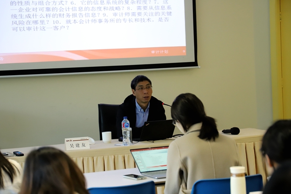 (撰稿:黄涵培)《审计理论与实务》的是由吴建友教授讲授的,这门课从审计计划、控制测试、实质性测试以及终结审计的基本思路与方法出发,将学生引导到审计理论与实务发展的前沿。吴老师教会我们理解企业及其环境并评估重大错报风险,包括可以利用PEST模型、对企业价值链进行分析、利用经典的波特五力模型等来了解被审计单位内部,同时通过分析企业的商业模式来了解外部环境,另一方面吴老师让我们了解了审计实务和理论,审计人员要明确最基本的审计道德。审计人员职业道德是为指导审计人员在从事审计工作中保持独立的地位、公正的态度和约束自己行为而制订的一整套职业道德规范。如此严谨的授课方式也正印证了吴老师身上一丝不苟的教学态度。吴老师对于实质性审计程序章节的授课尤为精彩,我愿意用故事的方式将吴老师的这一部分内容展现出来。