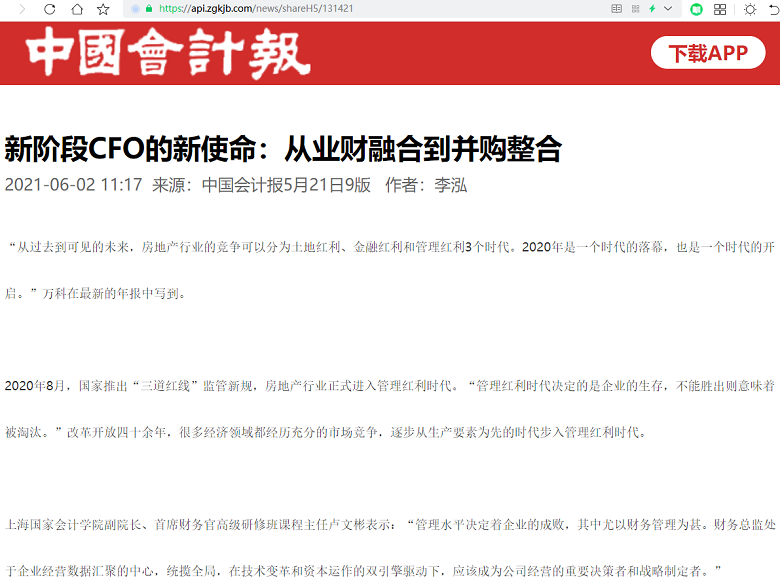 新阶段CFO的新使命:从业财融合到并购整合【2021年6月2日,中国会计报】
