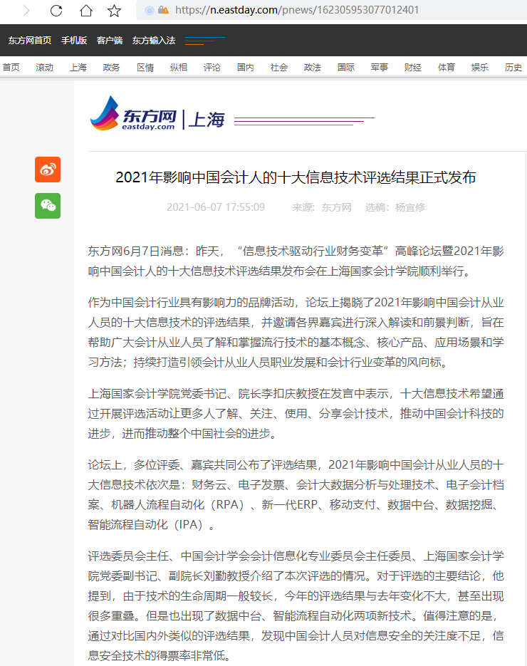 2021年影响中国会计人的十大信息技术评选结果正式发布【2021年6月7日,东方网】