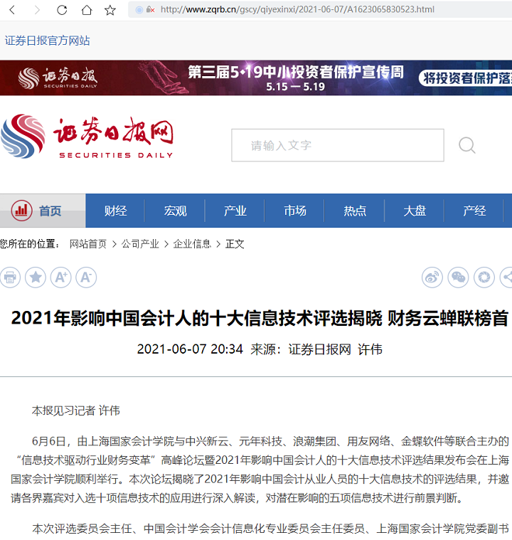 2021年影响中国会计人的十大信息技术评选揭晓 财务云蝉联榜首【2021年6月7日,证券日报】