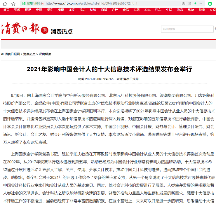 2021年影响中国会计人的十大信息技术评选结果发布会举行【2021年6月8日,消费日报】