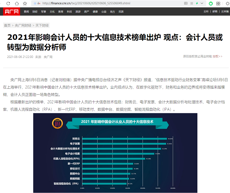 2021年影响会计人员的十大信息技术榜单出炉 观点:会计人员或转型为数据分析师【2021年6月6日,央广网】
