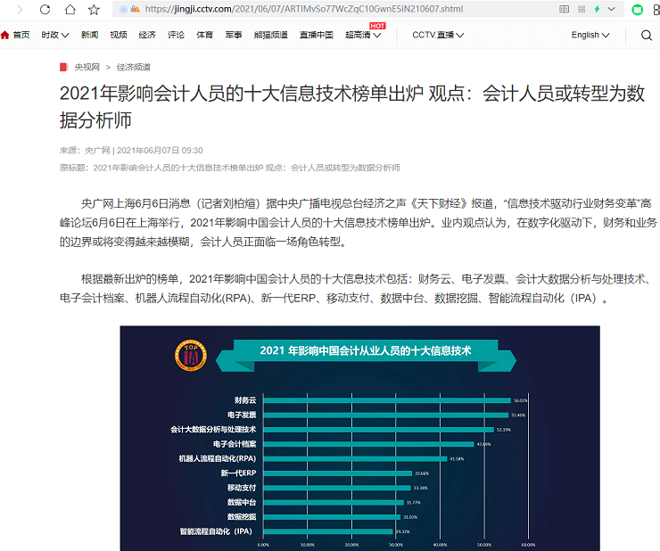 2021年影响会计人员的十大信息技术榜单出炉 观点:会计人员或转型为数据分析师【2021年6月7日,央视网】