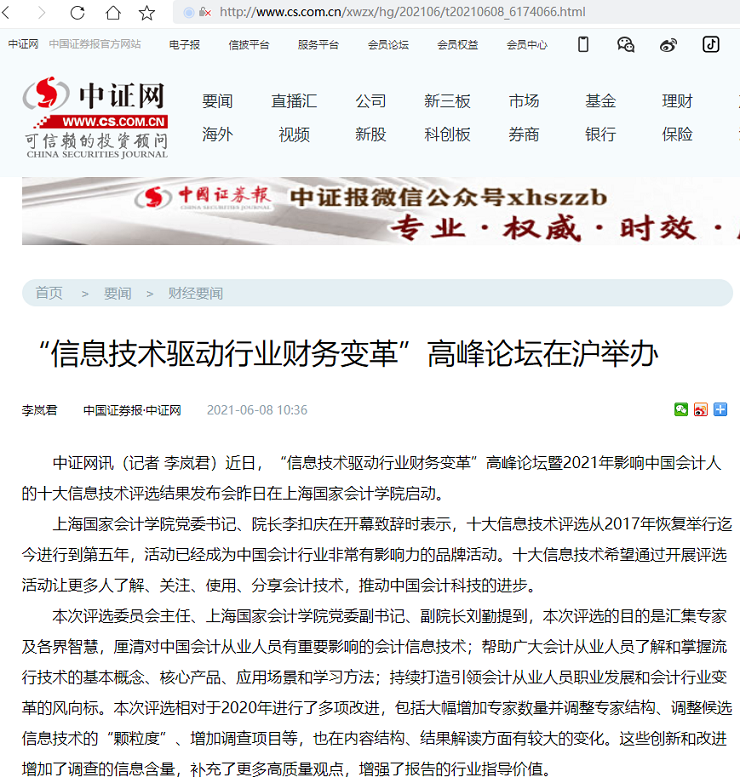 “信息技术驱动行业财务变革”高峰论坛在沪举办【2021年6月8日,中国证券报】