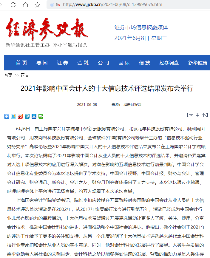 2021年影响中国会计人的十大信息技术评选结果发布会举行【2021年6月8日,经济参考报】