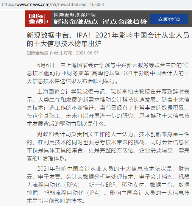 新现数据中台、IPA!2021年影响中国会计从业人员的十大信息技术榜单出炉【2021年6月7日,国际金融报】