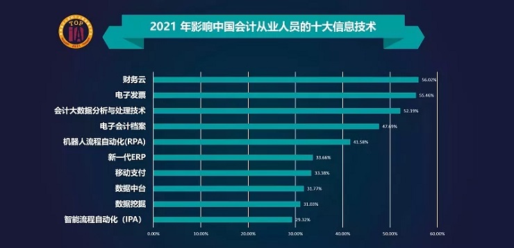 根据最新出炉的榜单,2021年影响中国会计人员的十大信息技术包括:财务云、电子发票、会计大数据分析与处理技术、电子会计档案、机器人流程自动化(RPA)、新一代ERP、移动支付、数据中台、数据挖掘、智能流程自动化(IPA)。