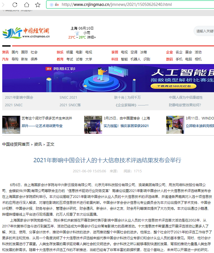 2021年影响中国会计人的十大信息技术评选结果发布会举行【2021年6月9日,中国经贸网】