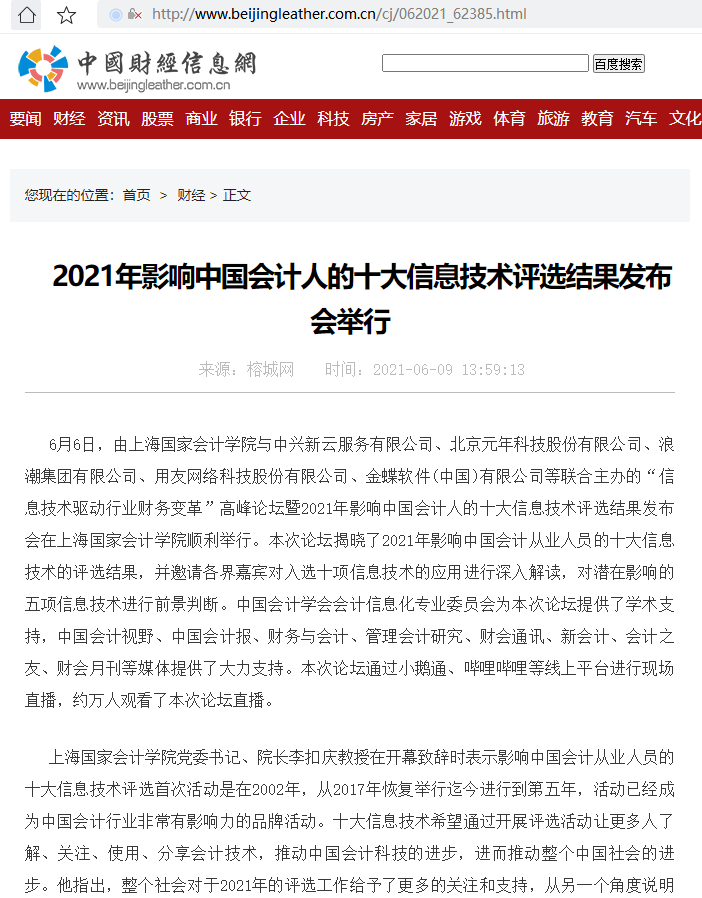 2021年影响中国会计人的十大信息技术评选结果发布会举行【2021年6月9日,中国财经信息网】