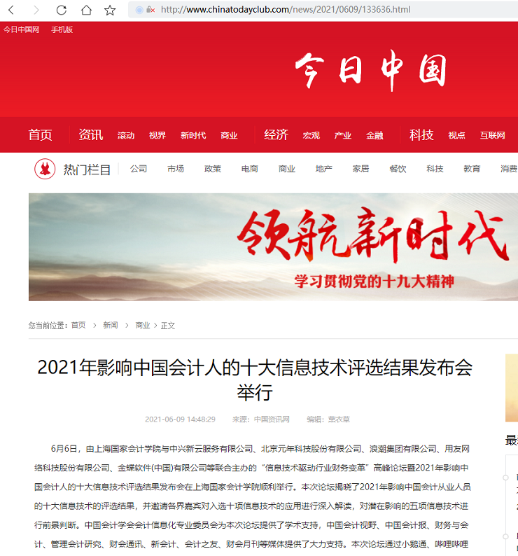 2021年影响中国会计人的十大信息技术评选结果发布会举行【2021年6月9日,今日中国】