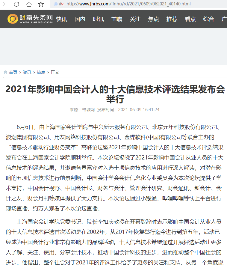 2021年影响中国会计人的十大信息技术评选结果发布会举行【2021年6月9日,财富头条网】