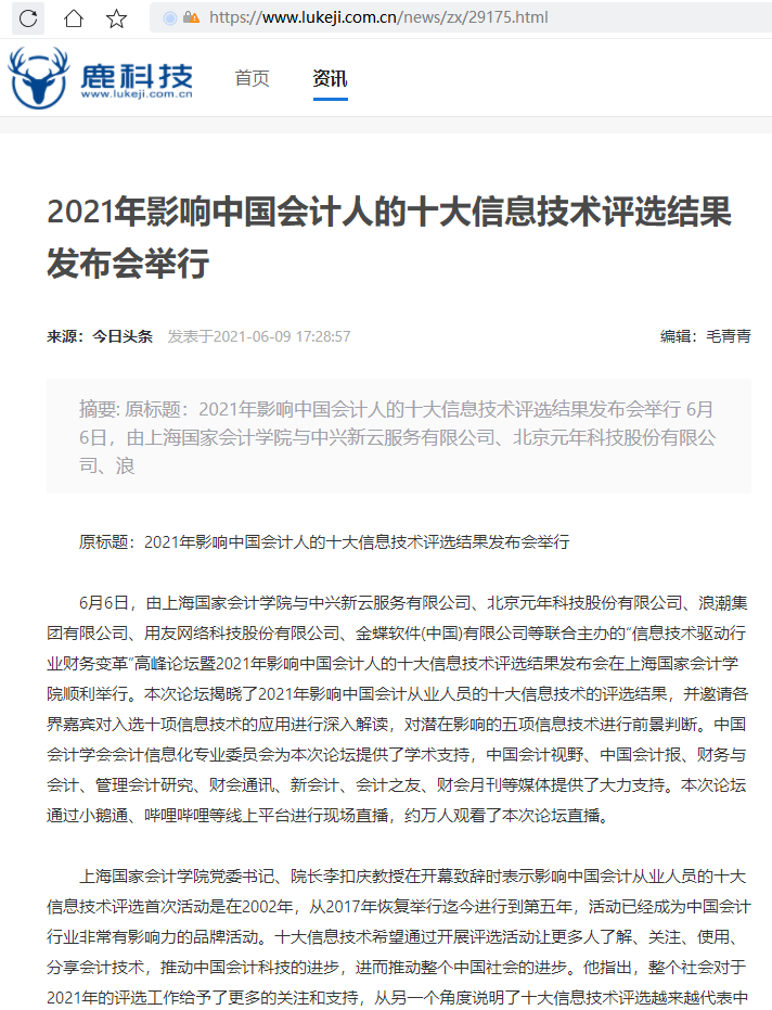 2021年影响中国会计人的十大信息技术评选结果发布会举行【2021年6月9日,鹿科技】