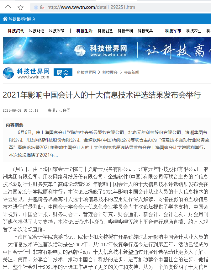 2021年影响中国会计人的十大信息技术评选结果发布会举行【2021年6月9日,科技世界网】