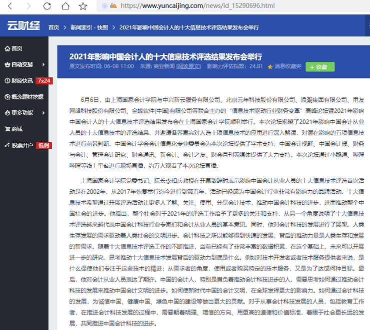 2021年影响中国会计人的十大信息技术评选结果发布会举行【2021年6月8日,云财经】