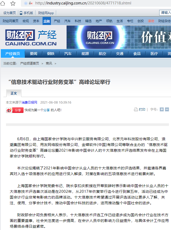 2021年影响中国会计人的十大信息技术评选结果发布会举行【2021年6月9日,财经网-产经】