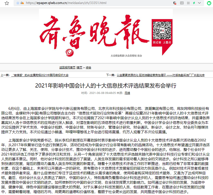 2021年影响中国会计人的十大信息技术评选结果发布会举行【2021年6月8日,齐鲁晚报网】