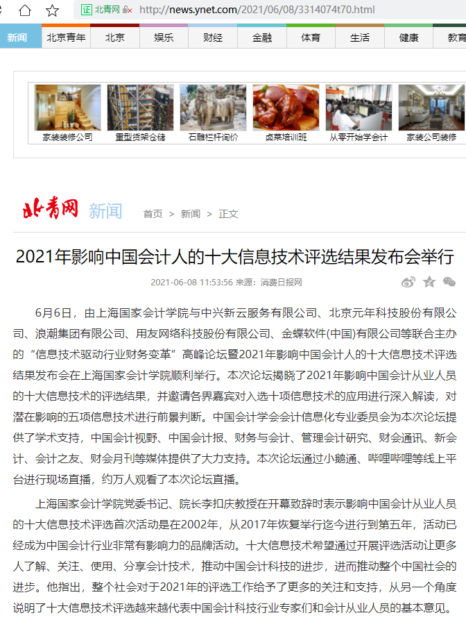 2021年影响中国会计人的十大信息技术评选结果发布会举行【2021年6月8日,北青网】