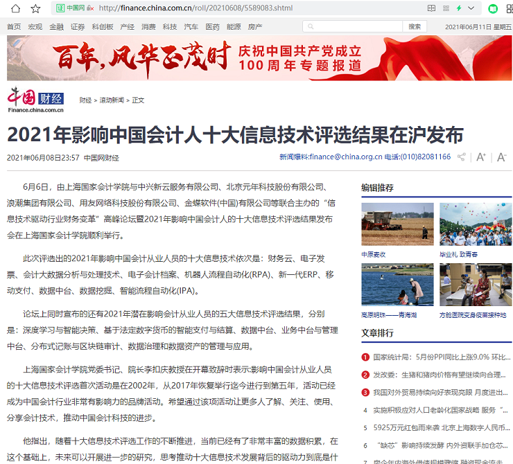 2021年影响中国会计人十大信息技术评选结果在沪发布【2021年6月8日,中国网-财经】