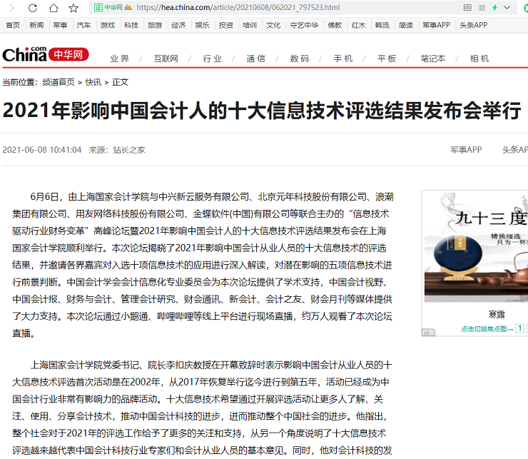 2021年影响中国会计人的十大信息技术评选结果发布会举行【2021年6月8日,中华网】