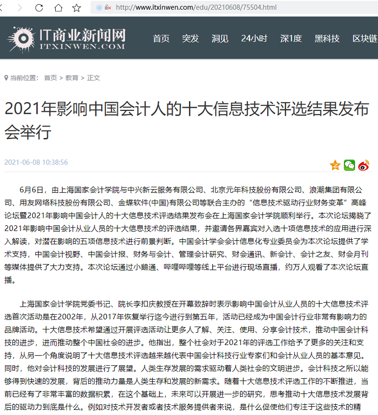 2021年影响中国会计人的十大信息技术评选结果发布会举行【2021年6月8日,IT商业新闻网】
