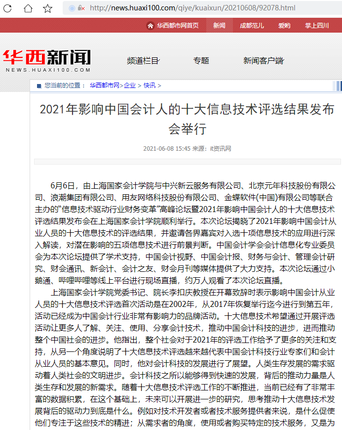 2021年影响中国会计人的十大信息技术评选结果发布会举行【2021年6月8日,华西都市网】