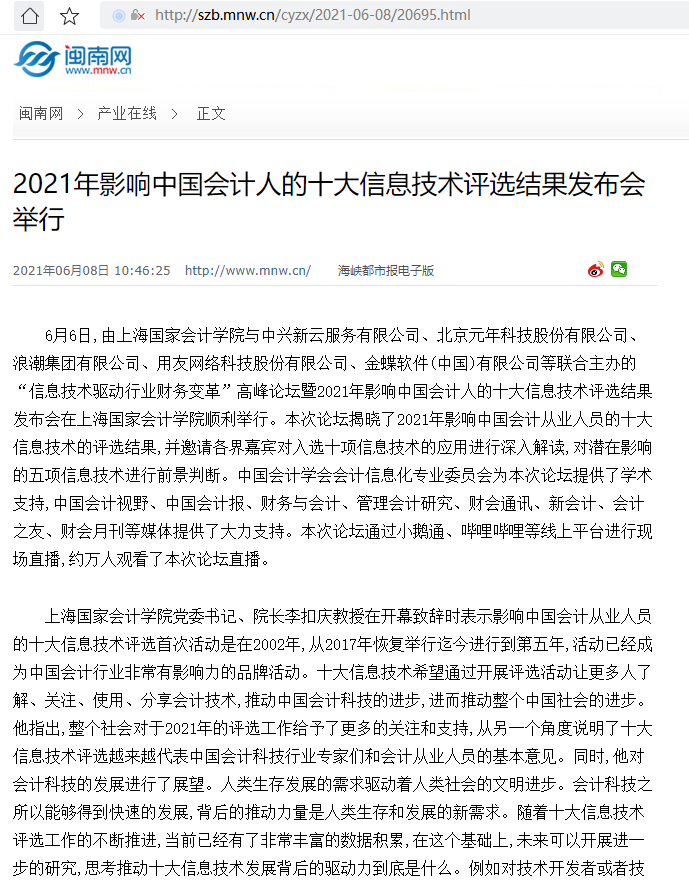2021年影响中国会计人的十大信息技术评选结果发布会举行【2021年6月8日,闽南网】