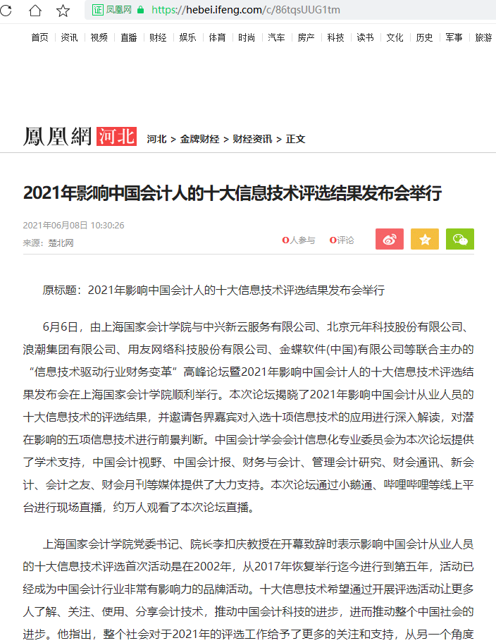 2021年影响中国会计人的十大信息技术评选结果发布会举行【2021年6月8日,凤凰网-河北】