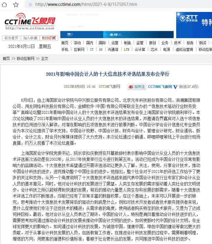 2021年影响中国会计人的十大信息技术评选结果发布会举行【2021年6月8日,飞象网】
