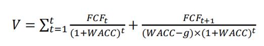 FCFF(Free Cash Flow to Firm)公司自由现金流,自由现金流是企业保持现有经营活动可持续的前提下可以自由支配的现金流,通常用经营活动现金流减去固定资产、无形资产的投资支出之后的余额计算得到。该模型的基本思路是基于企业是项目的结合体,了解企业的价值可以通过计算企业全部项目预期未来现金流量的限制。将所有项目现金流量的总和称为经营活动产生的现金流量。由于持续经营假设,新项目总在旧项目快要到期时开始投资或者建造,而投资是会导致现金流出的,我们将这种投资性质的现金流出称为资本支出或者经营活动中的现金投资,二者之差就是公司自由现金流。沿用股利贴现模型中的方法,我们假定T期以后每期自由现金流会是一个稳定的常数,那么持续价值就可以通过企业未来自由现金流的折现计算得出。下图是企业自由现金流折现模型公式: