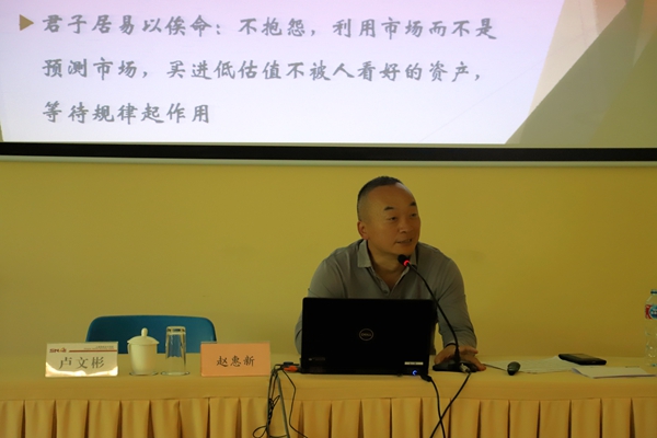 5月24日下午,2020级财务报表分析A班全体师生参加了主题为“金融机器与君子不器”的讲座。本次讲座主讲人是著名投资人赵惠新博士。在赵博士的精彩演讲下,我们所有同学一起领略了投资与金融的魅力。