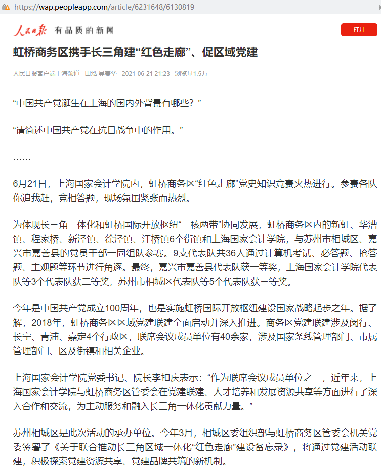 虹桥商务区携手长三角建“红色走廊”、促区域党建【2021年6月21日,人民日报】