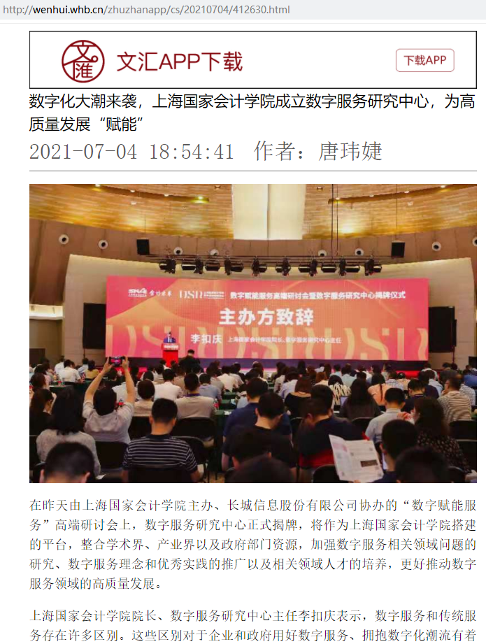 数字化大潮来袭,上海国家会计学院成立数字服务研究中心,为高质量发展“赋能”【2021年7月4日,文汇报】