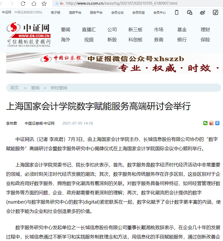 上海国家会计学院数字赋能服务高端研讨会举行【2021年7月5日,中国证券报】