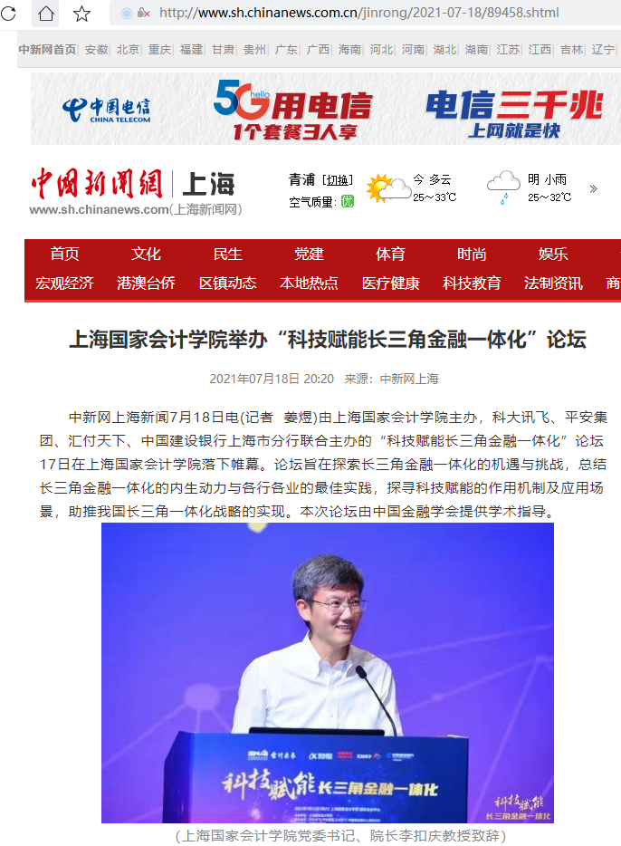 上海国家会计学院举办“科技赋能长三角金融一体化”论坛【2021年7月18日,中新社】