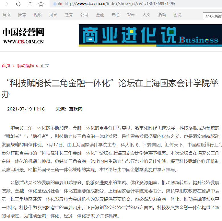 “科技赋能长三角金融一体化”论坛在上海国家会计学院举办【2021年7月19日,中国经营报】