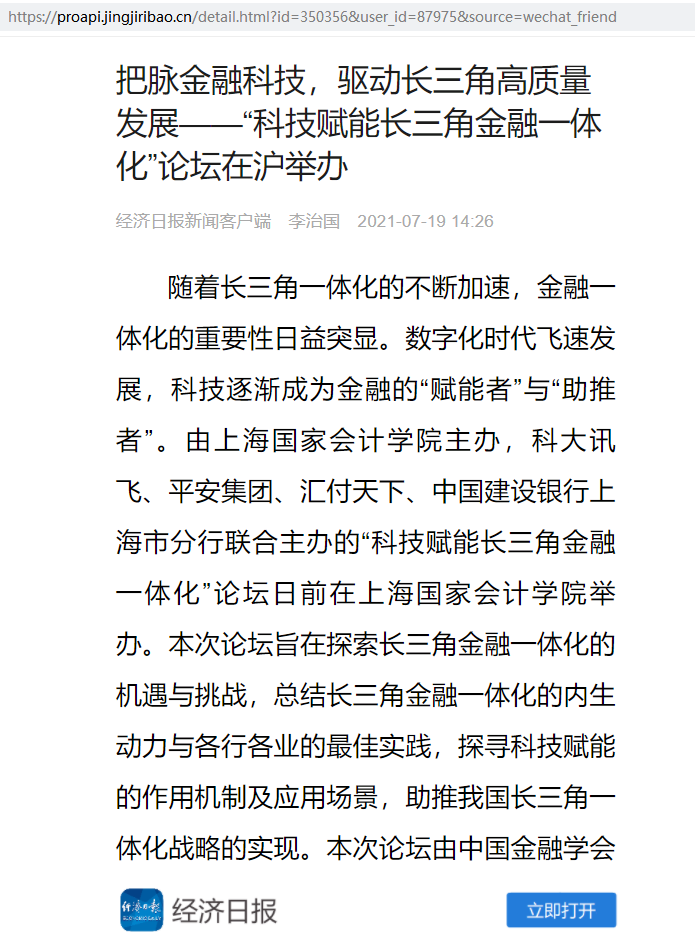 把脉金融科技,驱动长三角高质量发展——“科技赋能长三角金融一体化”论坛在沪举办【2021年7月19日,经济日报】