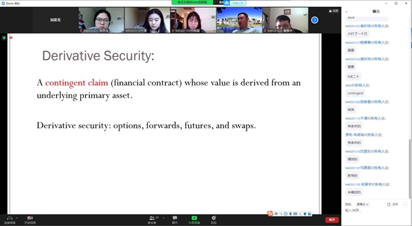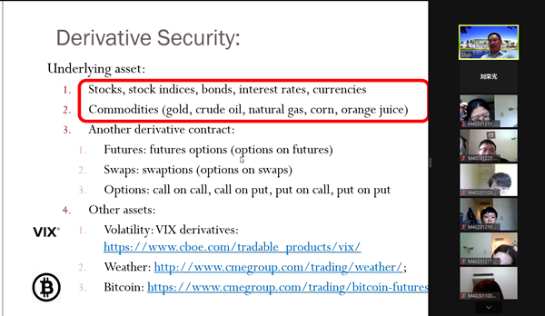 (撰稿:何其凝)充实的4周云上课程结束了,来自迈阿密大学的宿铁老师用中英混合的授课模式,带领大家初探金融衍生工具的世界。一说到金融,我们总不免想起华尔街,想起西装革履的华尔街精英,就像老师推荐的电影《Big hit》中一开始的画面,群英荟萃。《Big hit》中有这样一句台词,投资是需要你以自己独特的方式去学习的一件事情。把时间轴拉回到第一天上午,老师向我们提了一个问题:“How much $$$ doyou expect in the future?”