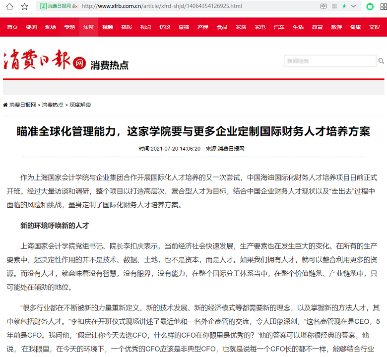瞄准全球化管理能力,这家学院要与更多企业定制国际财务人才培养方案【2021年7月20日,消费日报】