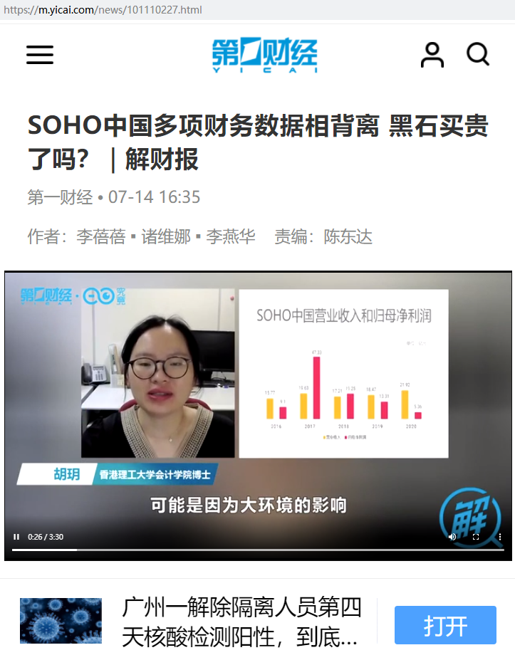 胡玥:SOHO中国多项财务数据相背离 黑石买贵了吗?|解财报【2021年7月14日,第一财经电视台】