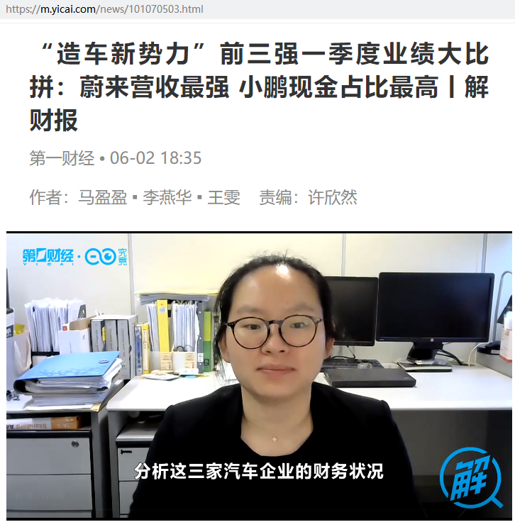 胡玥:“造车新势力”前三强一季度业绩大比拼:蔚来营收最强 小鹏现金占比最高丨解财报【2021年6月2日,第一财经电视台】