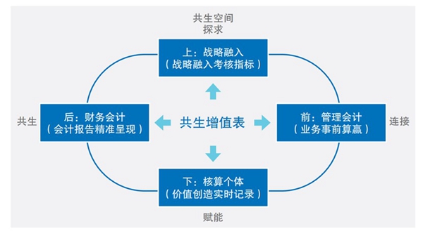 “前”——财务管理创新的核心是管理会计,管理会计作为创新的先锋,需要通过与内外部系统之间的连接实现业务的事前算赢,激活组织;“后”——财务会计承担原有三大财务报表的核算任务,实现会计报告的精准呈现,具体包含及时、精准、真实、可靠等特征;“上”——关注外部战略,将战略融入企业考核指标,以此支撑企业与利益相关者形成一个共生空间,共生空间的探寻需要超越单独个体的视角,在本行业或是跨行业探索企业与其他主体共存的新可能性(如平台、集团、联盟、集群等);“下”——实时呈现员工个体对于顾客价值增值的贡献,及时衡量员工对顾客价值增值的贡献,实现对员工的及时激励和高效激活。