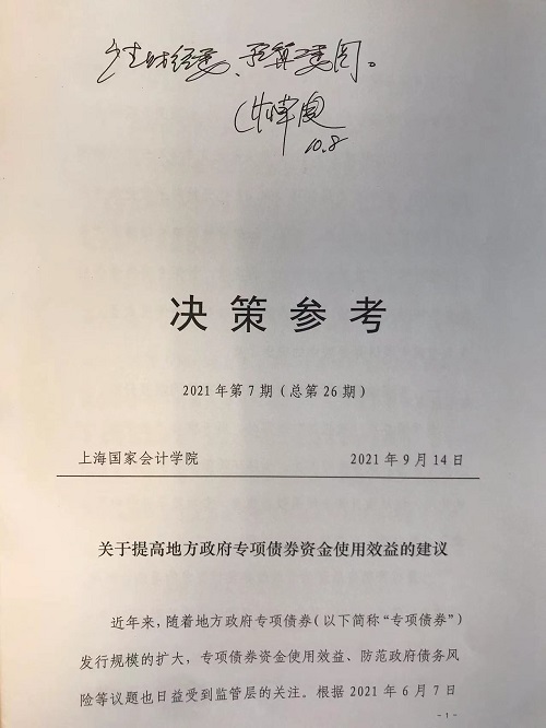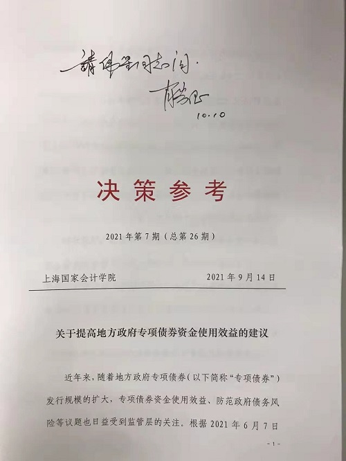 近日,学院《决策参考》2021年第7期文章《关于提高地方政府专项债券资金使用效益的建议》获上海市人大常委会主任蒋卓庆、常委会副主任肖贵玉批示。该文由学院政府采购与绩效管理中心主任章辉教授联合院外专家共同完成。