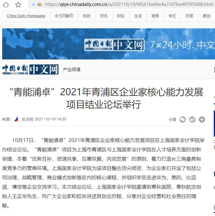 “青能浦卓”2021年青浦区企业家核心能力发展项目结业论坛举行【2021年10月19日,中国日报】