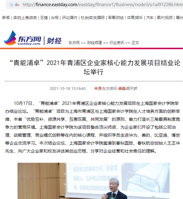 “青能浦卓”2021年青浦区企业家核心能力发展项目结业论坛举行【2021年10月18日,东方网】