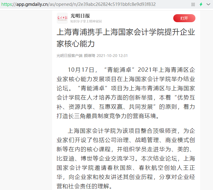 上海青浦携手上海国家会计学院提升企业家核心能力【2021年10月20日,光明日报】